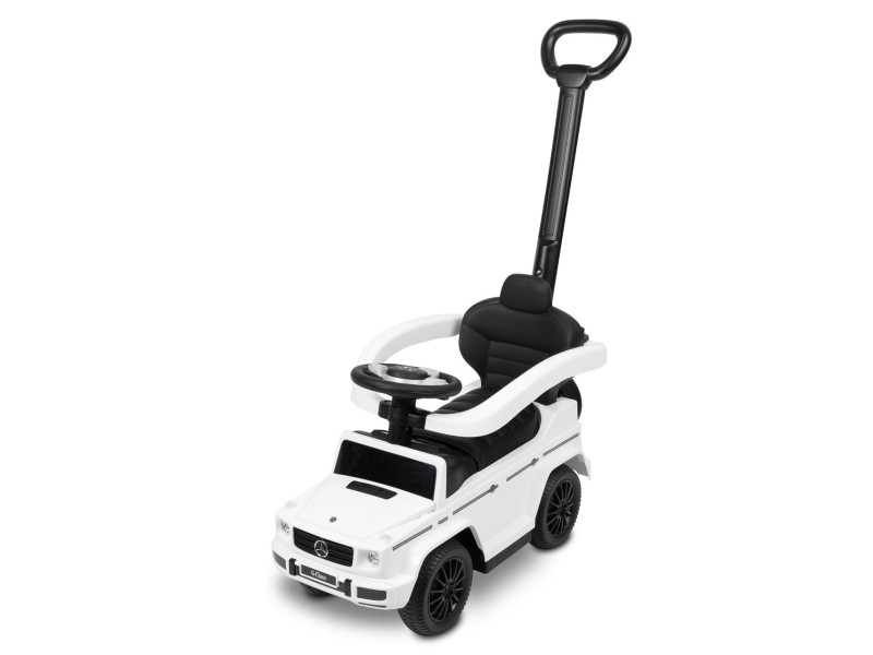 Автомобіль Mercedes G 350 D від Toyz (Caretero) — це ліцензований автомобіль для їзди а також ходунки і штовхач в одному. Його зовнішній вигляд відображає зовнішній вигляд культових автомобілів G-класу. Завдяки відкриваючим бар`єрам, висувним підніжкам і ручці для керування транспортний засіб перетворюється на штовхач, призначений для найменших дітей. Батько, розібравши окремі елементи, може швидко перетворити його на машинку, якою дитина зможе пересувати самостійно. У цій версії модель оснащена тихими, міцними колесами з піни. Крім того, сидіння оббите м’якою екошкірою, що забезпечує комфорт водіння та легке очищення. Урізноманітнить керування Мерседесом кермо зі звуковими ефектами. Батьки оцінять відділення під сидінням для речей.