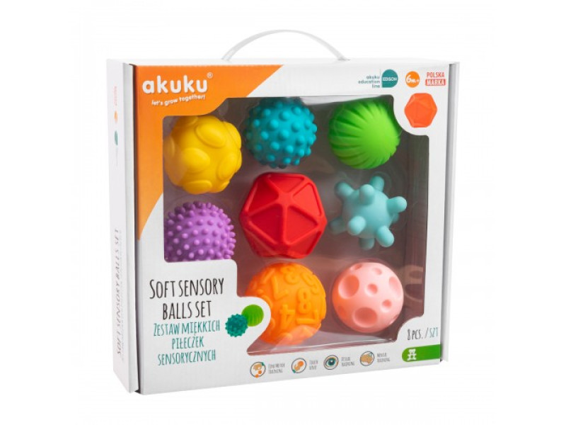 Набір з 8 м`яких гумових сенсорних кульок від бренду akuku познайомить вашого малюка зі світом дотиків, кольорів та звуків. Завдяки різноманітній текстурі, кожен м`яч дає дитині різні сенсорні відчуття. Різні форми та їх опуклі кінчики вчать дитину поєднувати та поєднувати елементи.