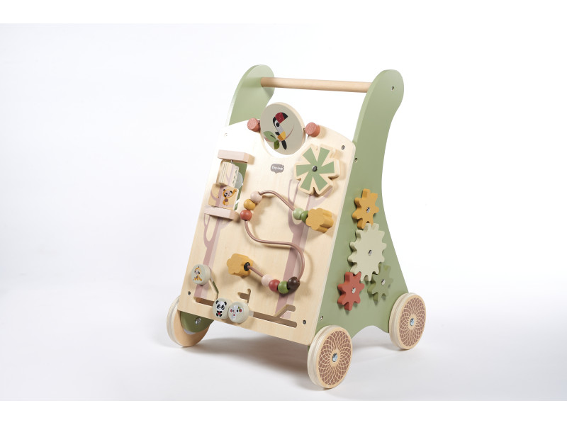 Ігровий центр допомагає дитині зробити впевнені перші кроки, розвиває рівновагу, координацію та моторику. Грайливі деталі — шестерні, рухомі намистини, крутячі диски з тваринками та інші активності