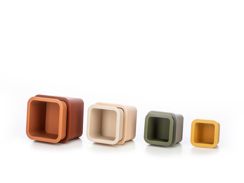 У наборі 7 силіконових чашок квадратної форми, кожна різного кольору та розміру. Їх можна складати один на одного або один в одного.