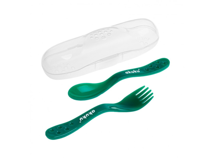 Набір фігурні столові прилади: вилка і ложка. Оснащені практичним футляром, вони виявлять себе поза домом — на прогулянках та в дорозі. Виготовлений із безпечних та якісних матеріалів, призначених для контакту з харчовими продуктами. Округлі форми столових приладів адаптовані до ніжних ясен маленької дитини. БФА безкоштовно.