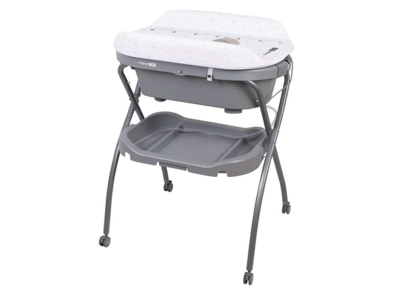Дитяча ванночка зі сталевим шасі, 4 колеса з гальмами, лоток для зберігання та пеленальний килимок із написом, із ПВХ. Підставку можна скласти, якщо зняти ванну. Милий килимок для сповивання з принтом коала. Дуже практичний для маленьких ванних кімнат, легко складається і чиститься.